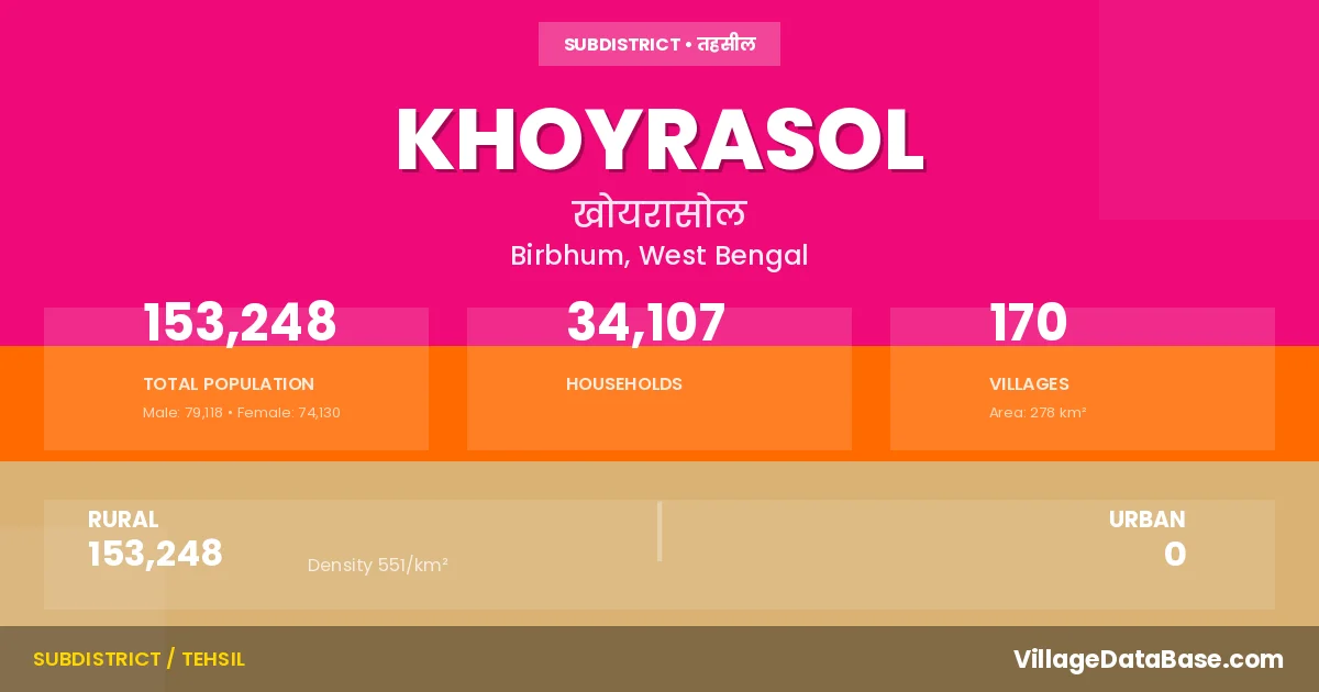 According to the 2011 census The total area of Khoyrasol Subdivision is 278 km², with a population of 153248 people. The population density is 551 inhabitants per square kilometre, and there are approximately 34107 houses in the sub district.
