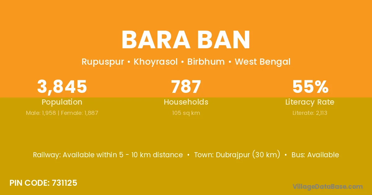 Dubrajpur (30 km) is the nearest town to Bara Ban village for major economic activities and is located approximately 30 km away.