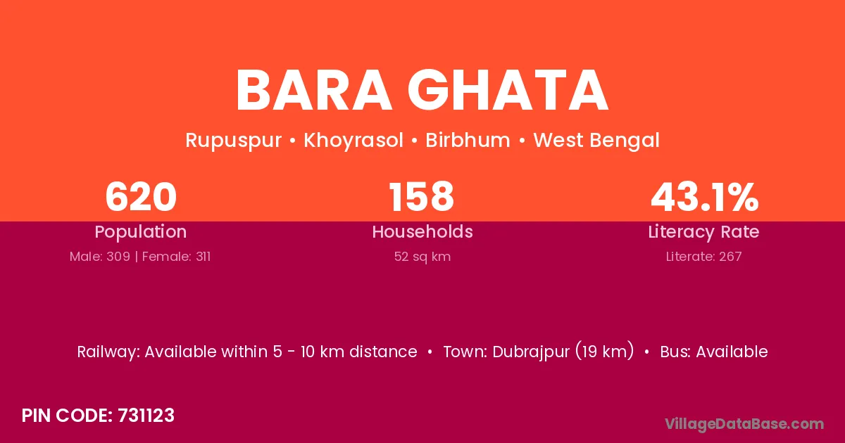 Dubrajpur (19 km) is the nearest town to Bara Ghata village for major economic activities and is located approximately 19 km away.