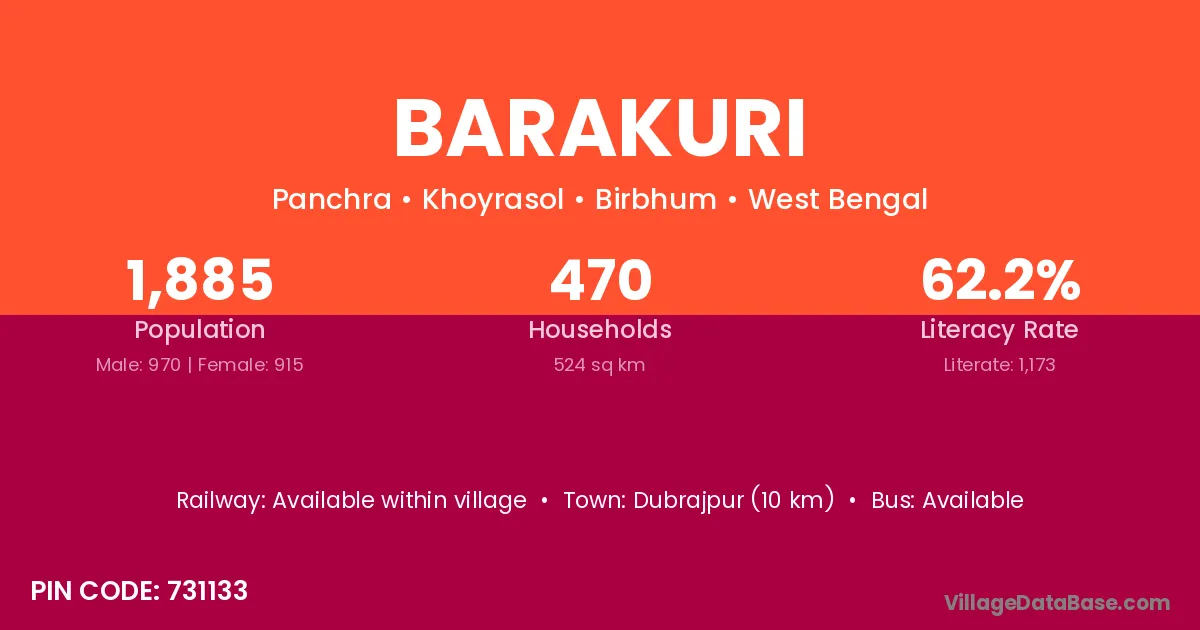 Dubrajpur (10 km) is the nearest town to Barakuri village for major economic activities and is located approximately 10 km away.