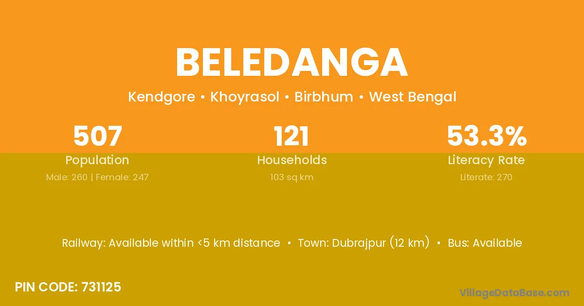 Dubrajpur (12 km) is the nearest town to Beledanga village for major economic activities and is located approximately 12 km away.