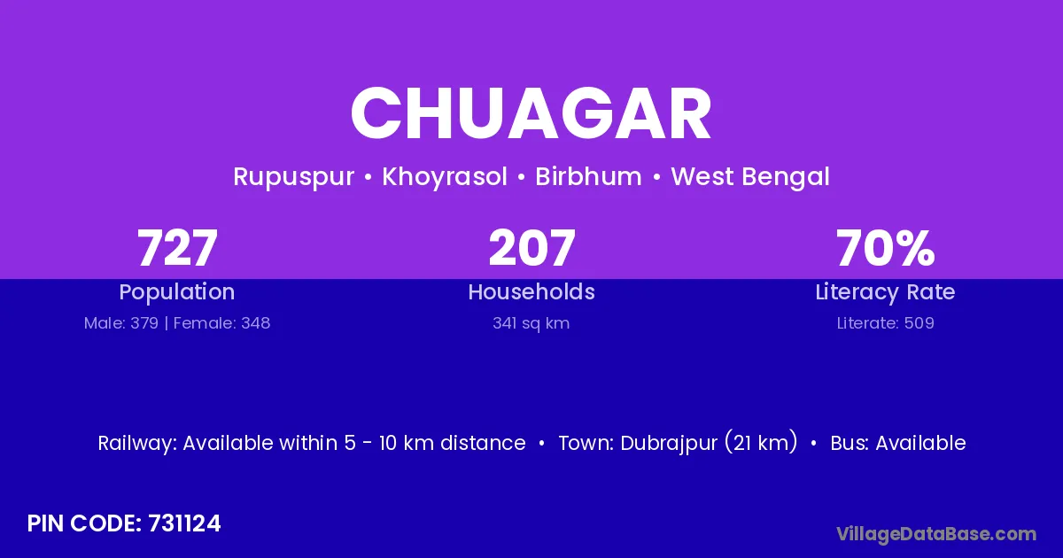 Dubrajpur (21 km) is the nearest town to Chuagar village for major economic activities and is located approximately 21 km away.