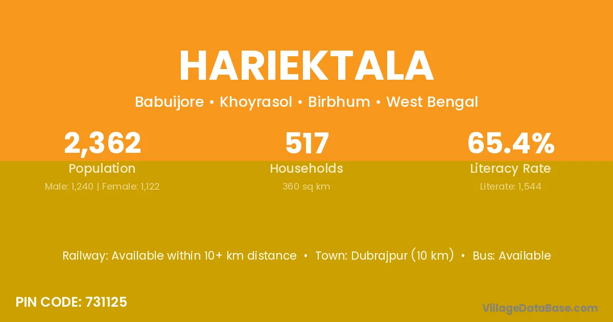 Dubrajpur (10 km) is the nearest town to Hariektala village for major economic activities and is located approximately 10 km away.