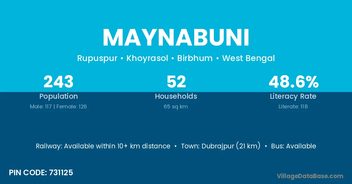 Dubrajpur (21 km) is the nearest town to Maynabuni village for major economic activities and is located approximately 21 km away.