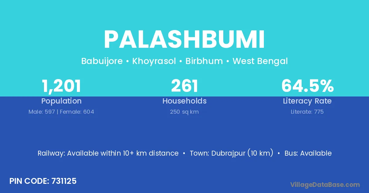 Dubrajpur (10 km) is the nearest town to Palashbumi village for major economic activities and is located approximately 10 km away.
