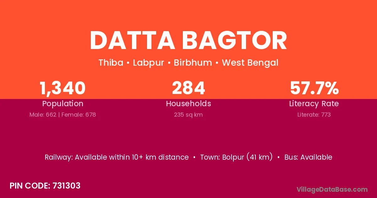 Bolpur (41 km) is the nearest town to Datta Bagtor village for major economic activities and is located approximately 41 km away.