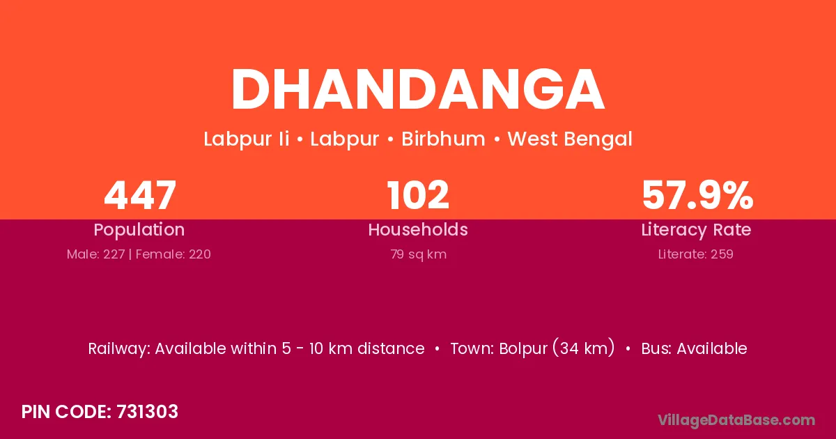 Bolpur (34 km) is the nearest town to Dhandanga village for major economic activities and is located approximately 34 km away.
