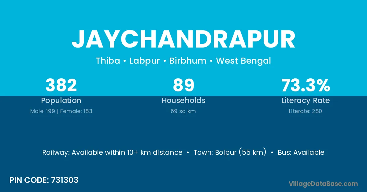 Bolpur (55 km) is the nearest town to Jaychandrapur village for major economic activities and is located approximately 55 km away.