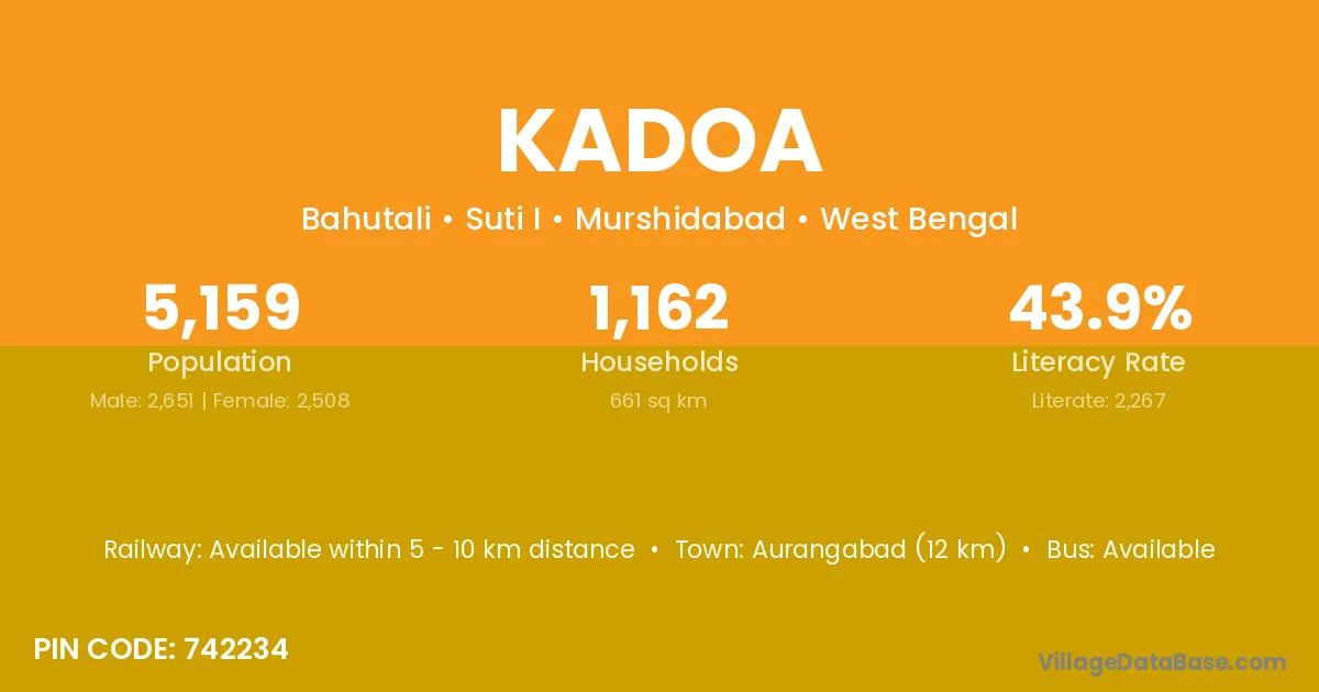 Bolpur (24 km) is the nearest town to Kadoa village for major economic activities and is located approximately 24 km away.