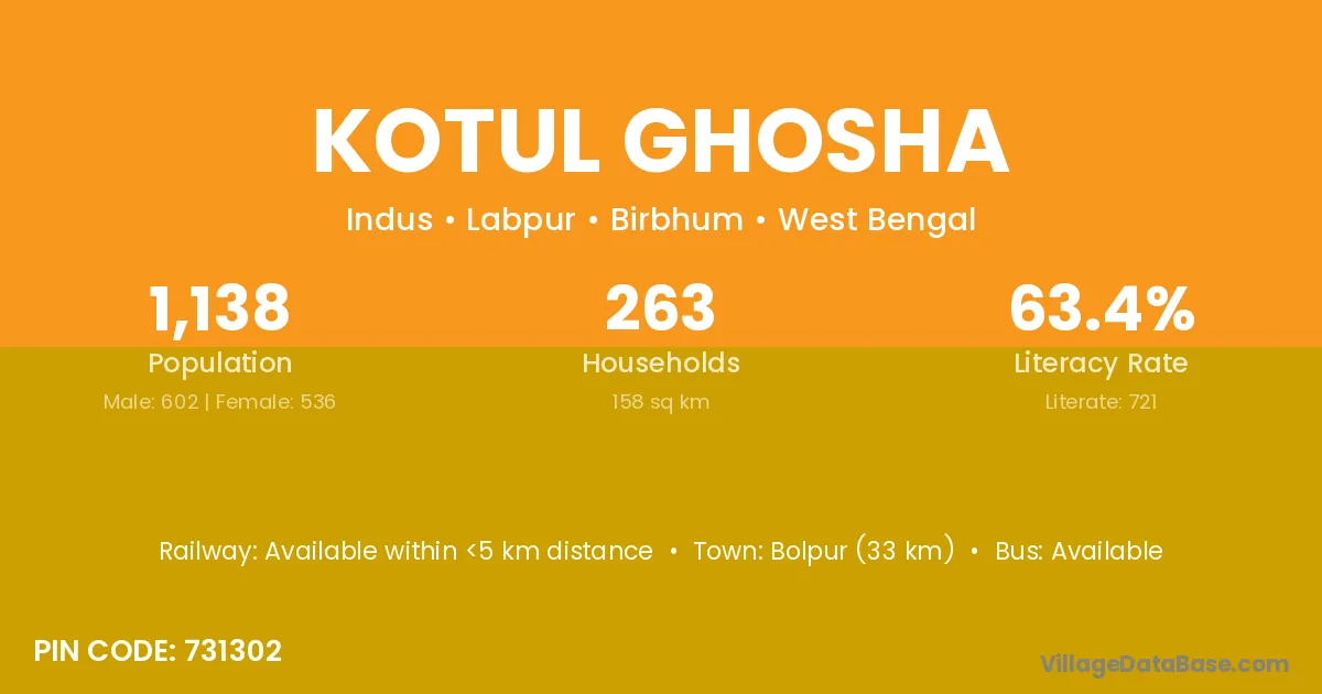 Bolpur (33 km) is the nearest town to Kotul Ghosha village for major economic activities and is located approximately 33 km away.
