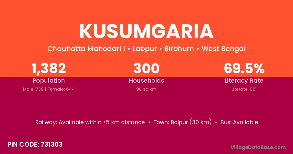 Bolpur (30 km) is the nearest town to Kusumgaria village for major economic activities and is located approximately 30 km away.