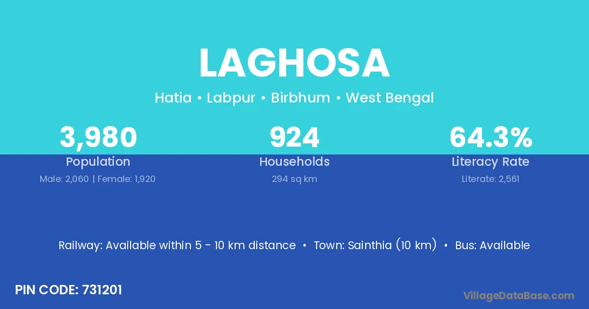 Sainthia (10 km) is the nearest town to Laghosa village for major economic activities and is located approximately 10 km away.