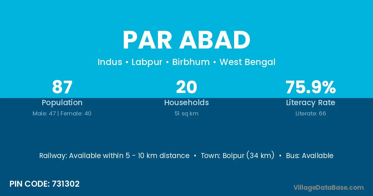 Bolpur (34 km) is the nearest town to Par Abad village for major economic activities and is located approximately 34 km away.
