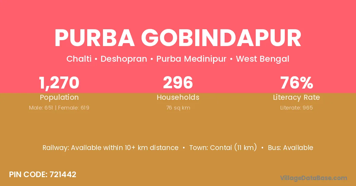 Bolpur (30 km) is the nearest town to Purba Gobindapur village for major economic activities and is located approximately 30 km away.