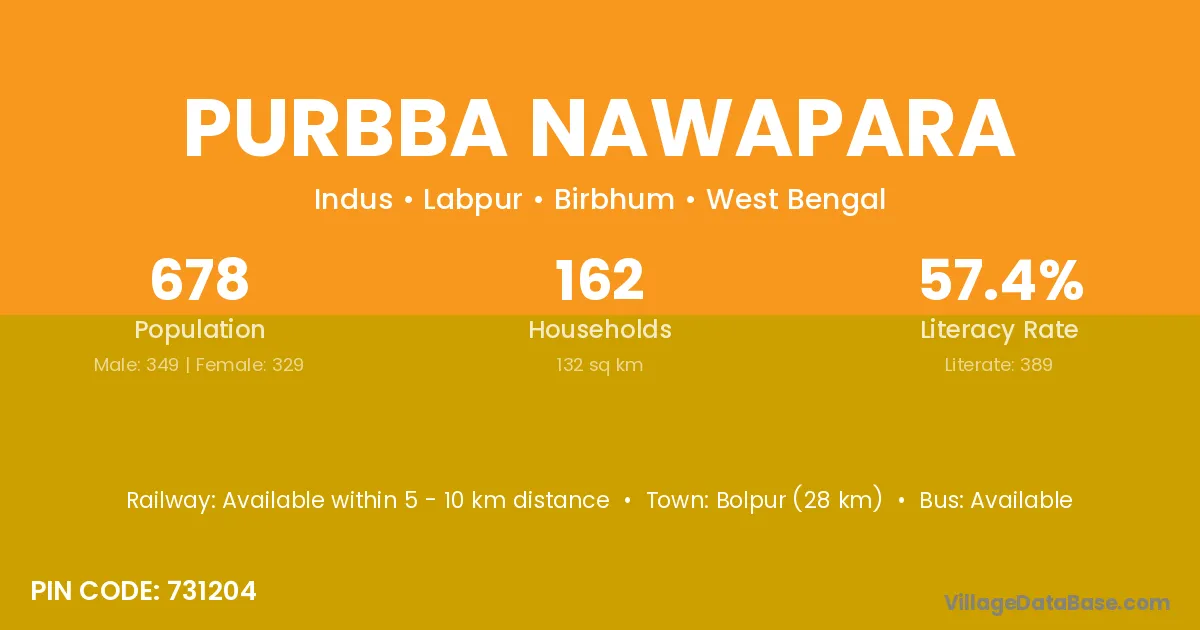 Bolpur (28 km) is the nearest town to Purbba Nawapara village for major economic activities and is located approximately 28 km away.