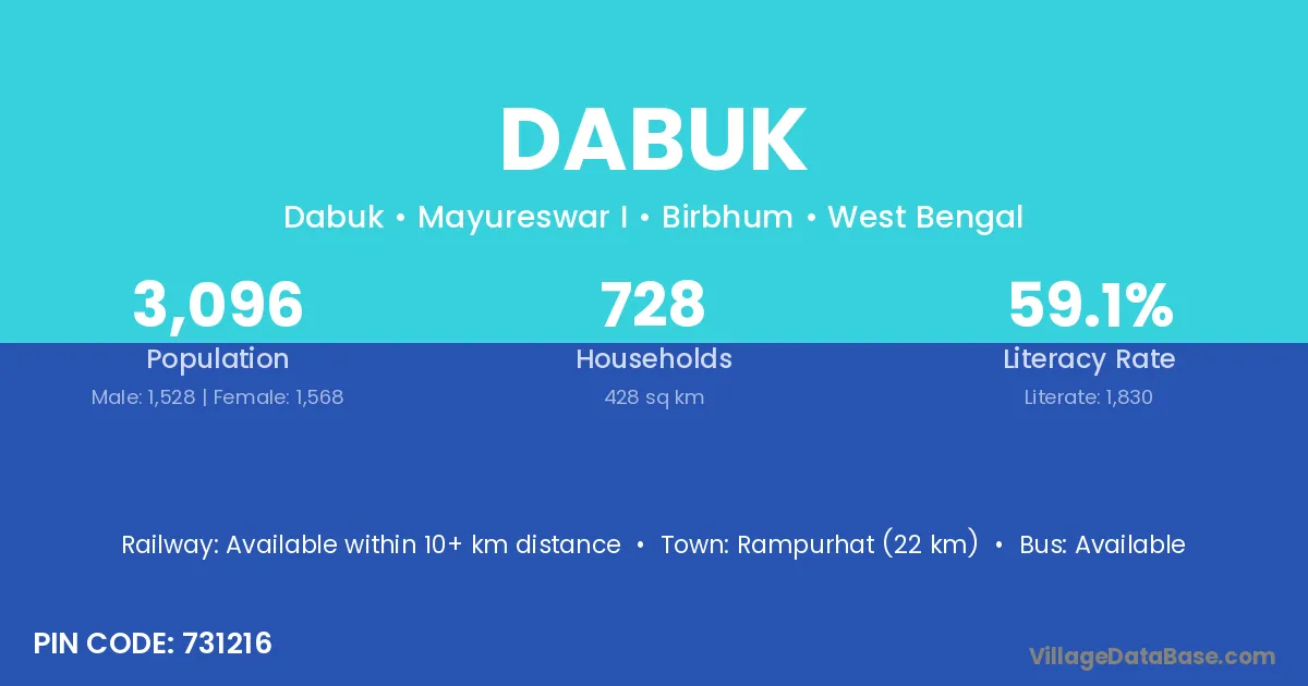 Rampurhat (22 km) is the nearest town to Dabuk village for major economic activities and is located approximately 22 km away.