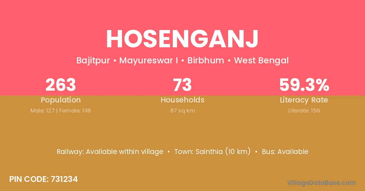 Sainthia (10 km) is the nearest town to Hosenganj village for major economic activities and is located approximately 10 km away.