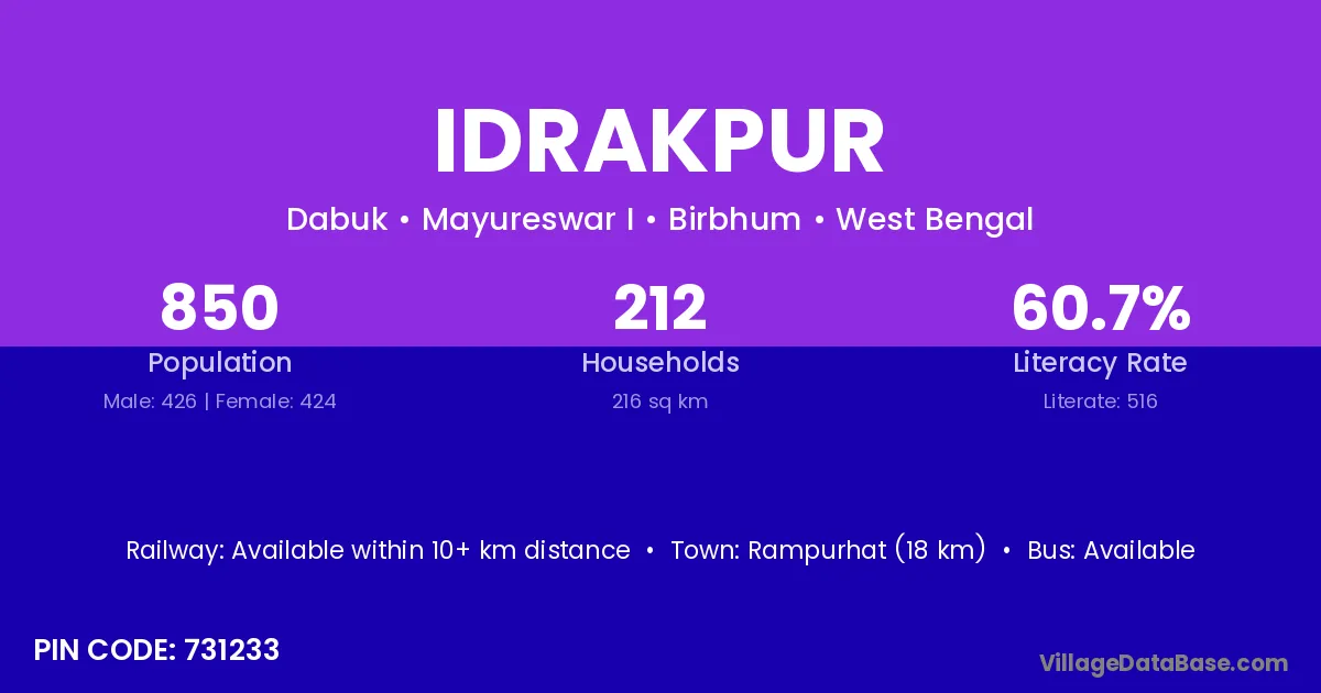 Rampurhat (18 km) is the nearest town to Idrakpur village for major economic activities and is located approximately 18 km away.