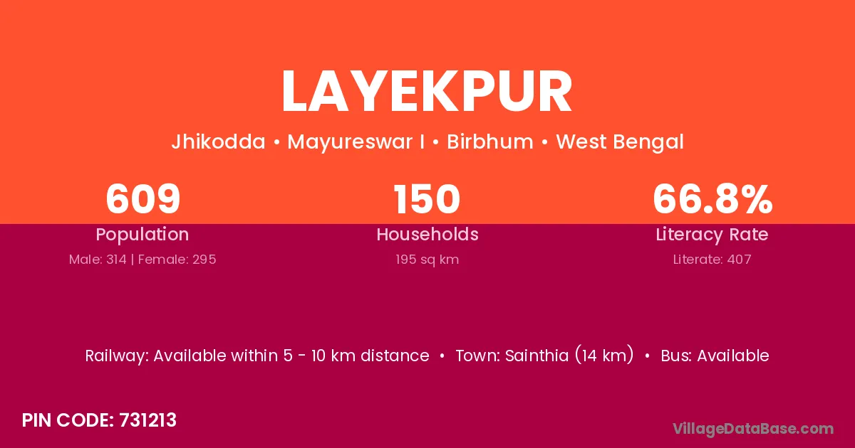 Sainthia (14 km) is the nearest town to Layekpur village for major economic activities and is located approximately 14 km away.