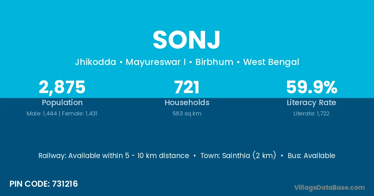 Sainthia (2 km) is the nearest town to Sonj village for major economic activities and is located approximately 2 km away.