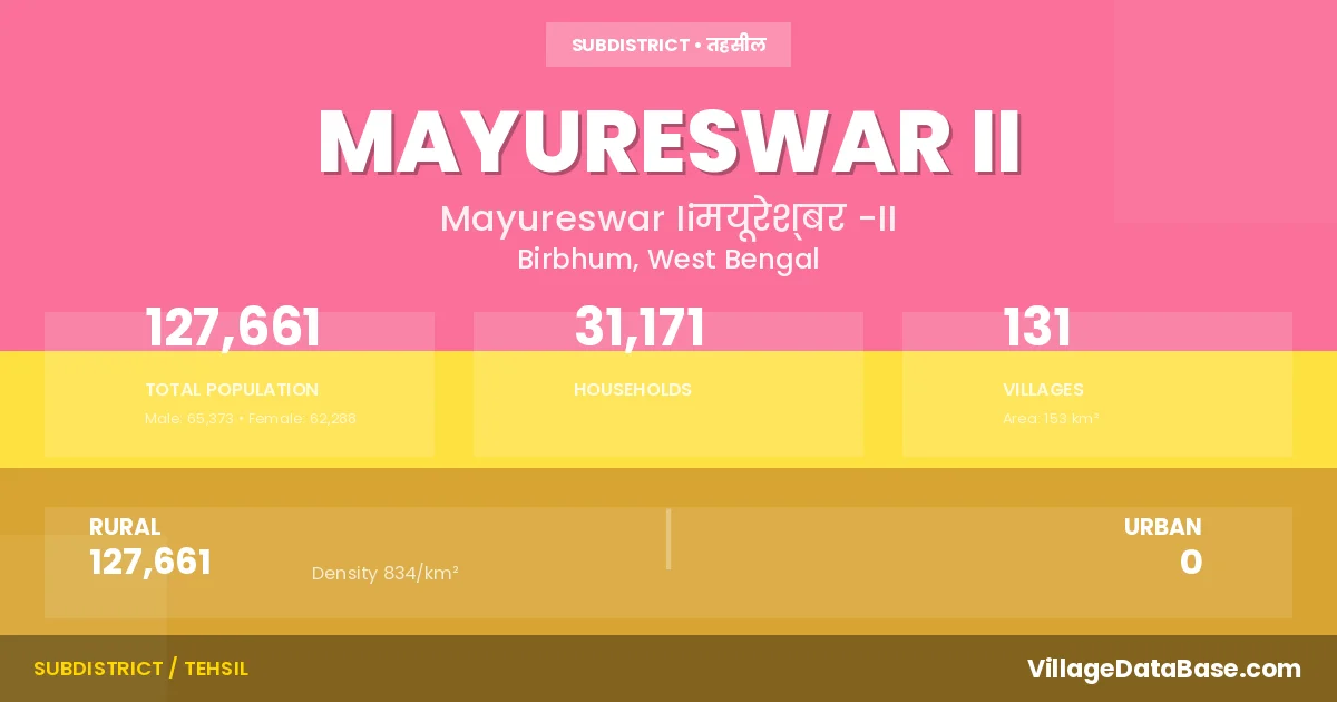 According to the 2011 census The total area of Mayureswar II Subdivision is 153 km², with a population of 127661 people. The population density is 834 inhabitants per square kilometre, and there are approximately 31171 houses in the sub district.