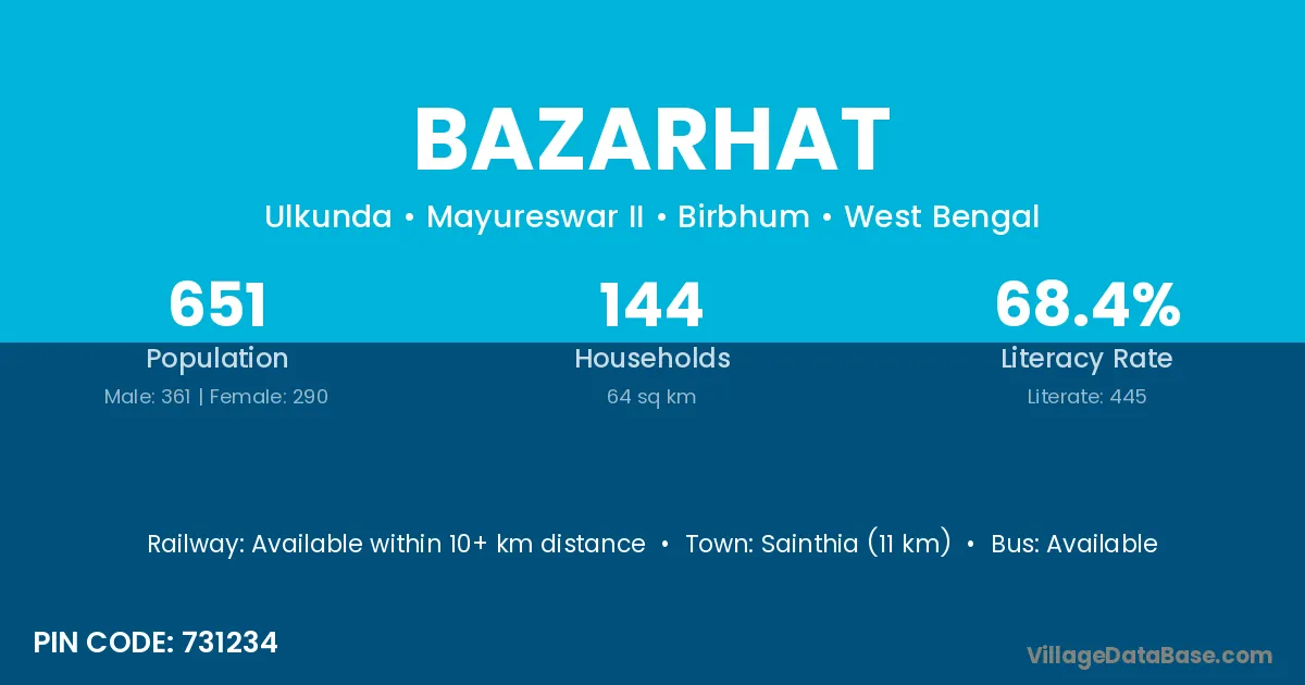 Sainthia (11 km) is the nearest town to Bazarhat village for major economic activities and is located approximately 11 km away.