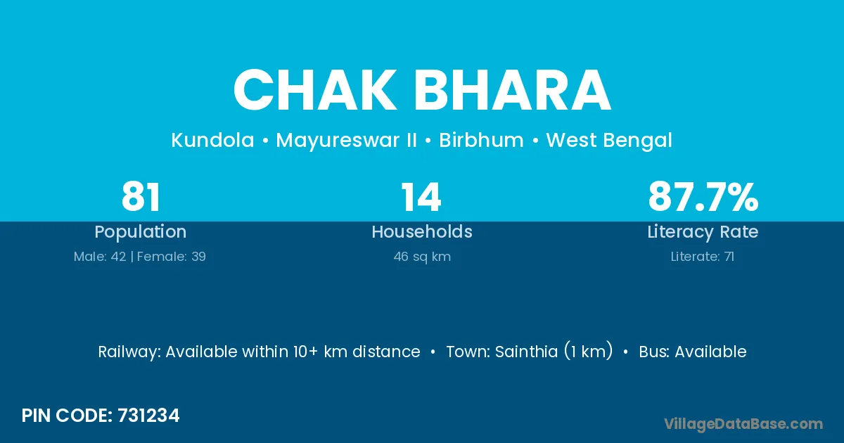 Sainthia (1 km) is the nearest town to Chak Bhara village for major economic activities and is located approximately 1 km away.