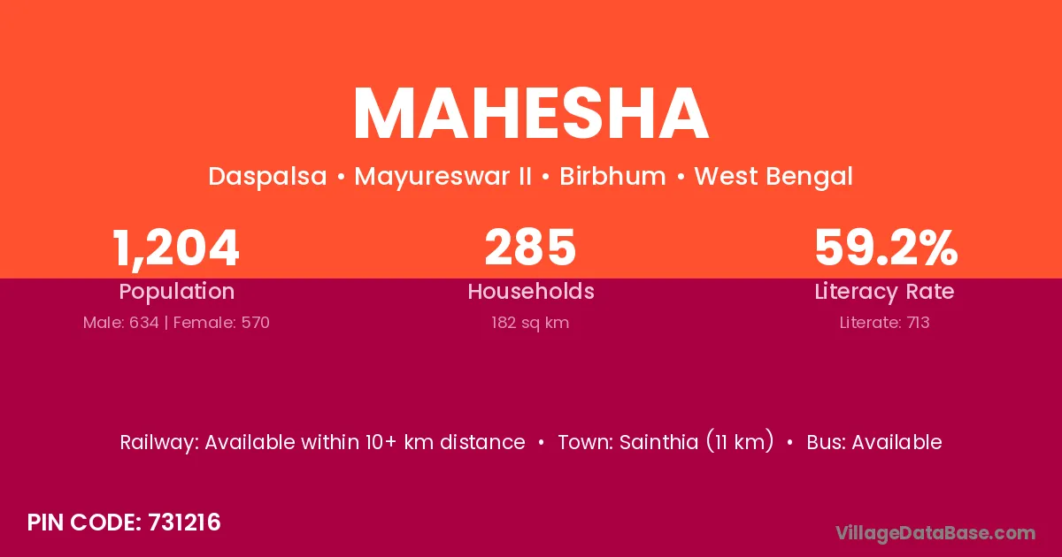 Sainthia (11 km) is the nearest town to Mahesha village for major economic activities and is located approximately 11 km away.