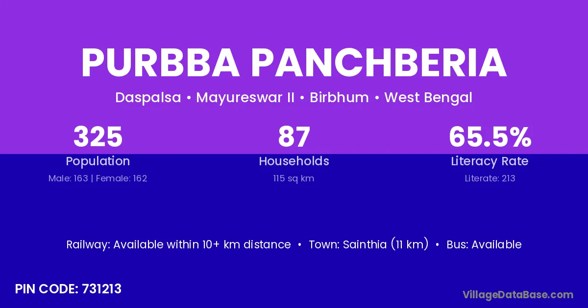Sainthia (11 km) is the nearest town to Purbba Panchberia village for major economic activities and is located approximately 11 km away.