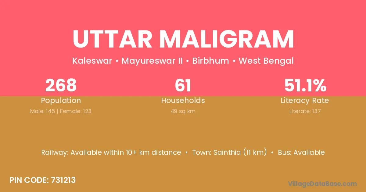 Sainthia (11 km) is the nearest town to Uttar Maligram village for major economic activities and is located approximately 11 km away.