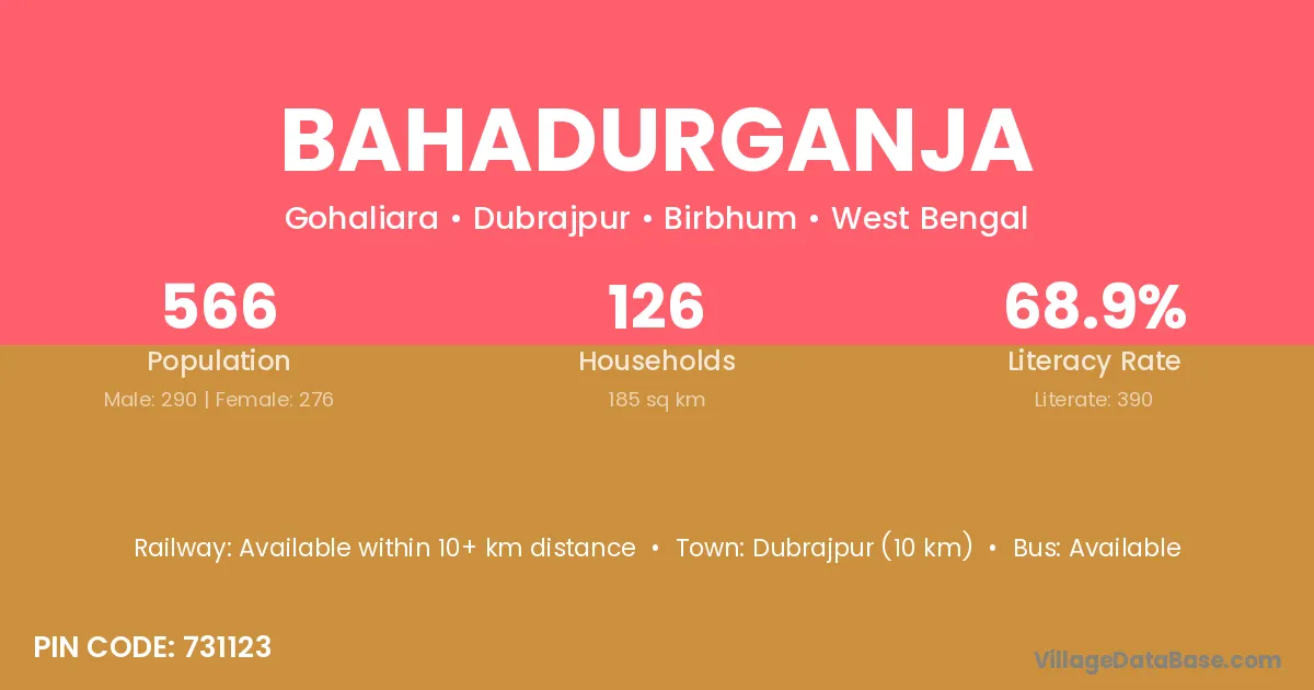 Suri (22 km) is the nearest town to Bahadurganja village for major economic activities and is located approximately 22 km away.