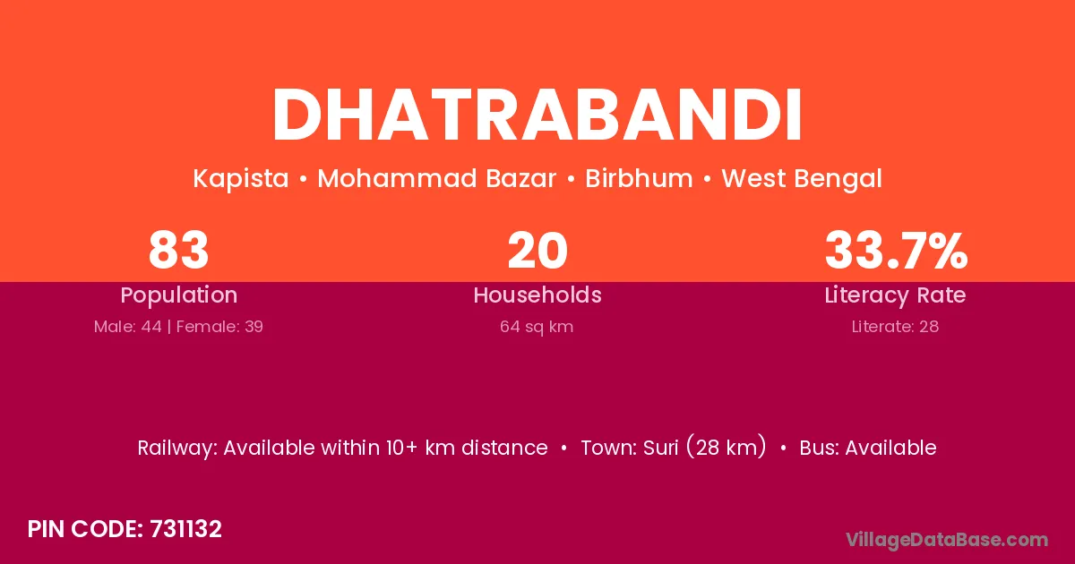 Suri (28 km) is the nearest town to Dhatrabandi village for major economic activities and is located approximately 28 km away.