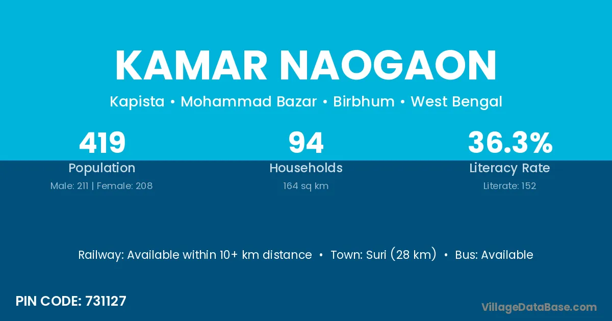 Suri (28 km) is the nearest town to Kamar Naogaon village for major economic activities and is located approximately 28 km away.