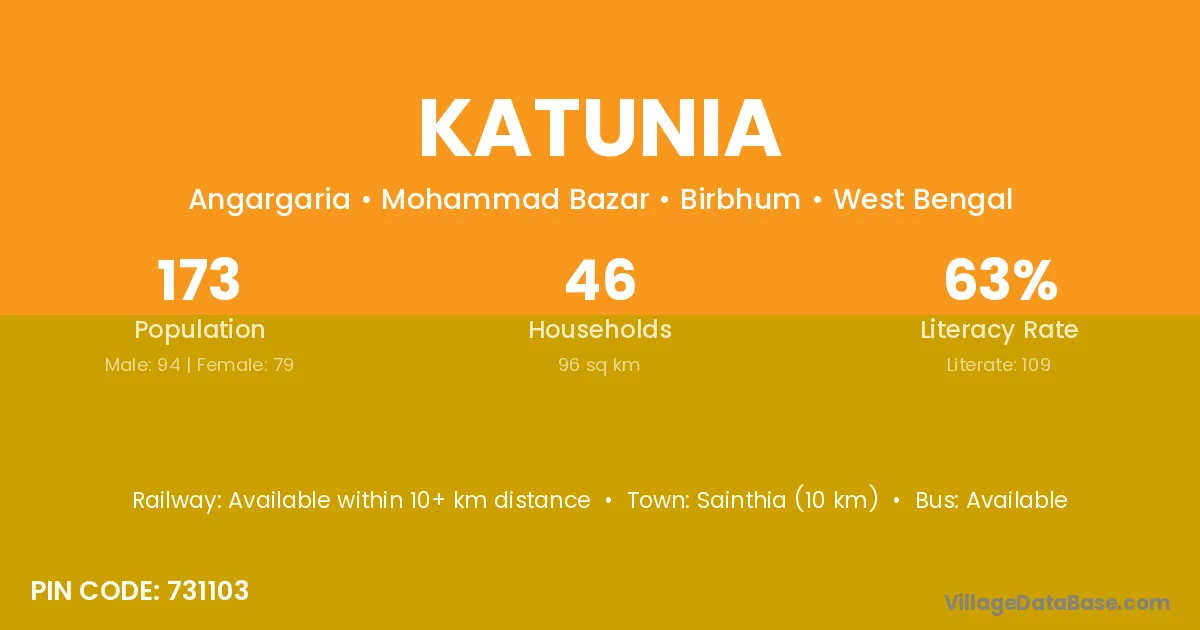 Sainthia (10 km) is the nearest town to Katunia village for major economic activities and is located approximately 10 km away.