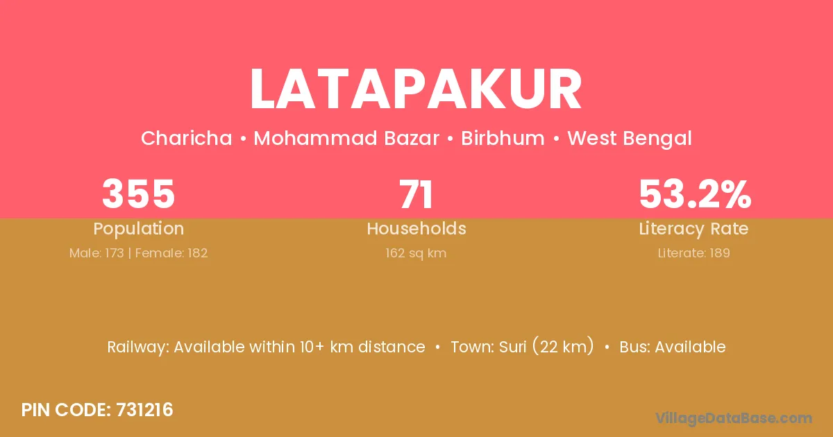 Suri (22 km) is the nearest town to Latapakur village for major economic activities and is located approximately 22 km away.