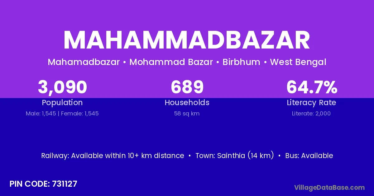 Sainthia (14 km) is the nearest town to Mahammadbazar village for major economic activities and is located approximately 14 km away.