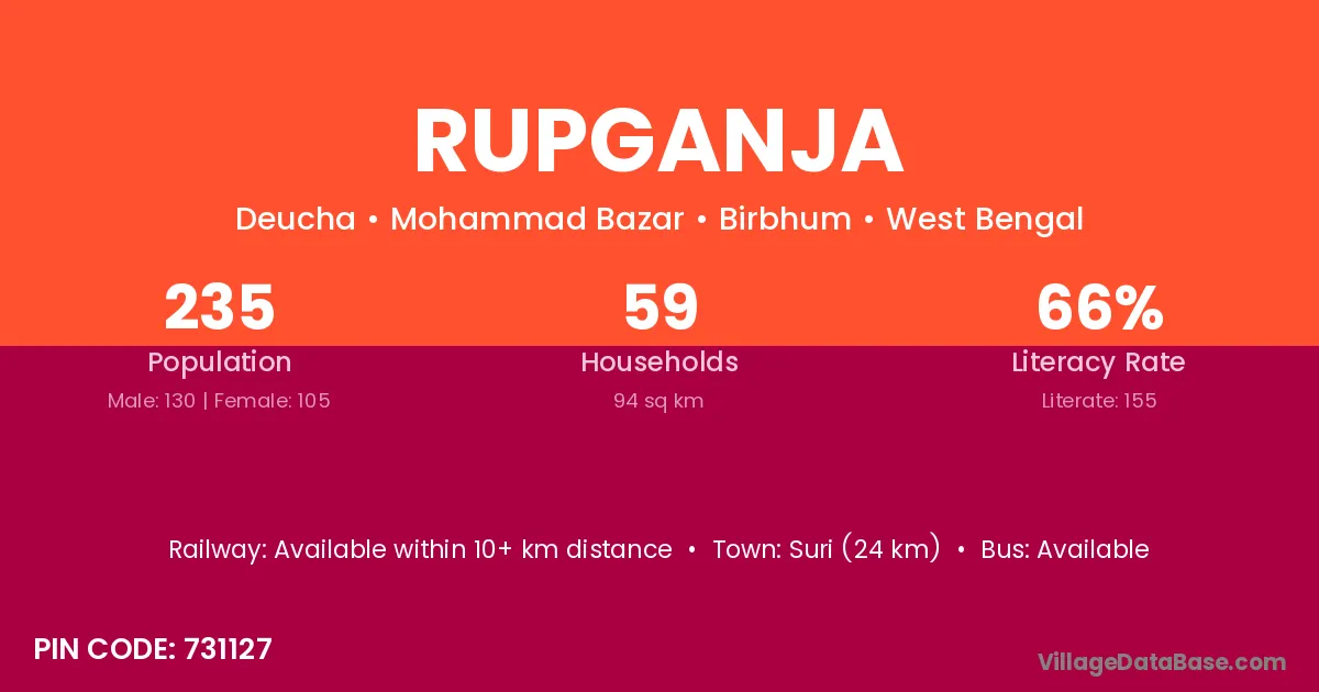 Suri (24 km) is the nearest town to Rupganja village for major economic activities and is located approximately 24 km away.