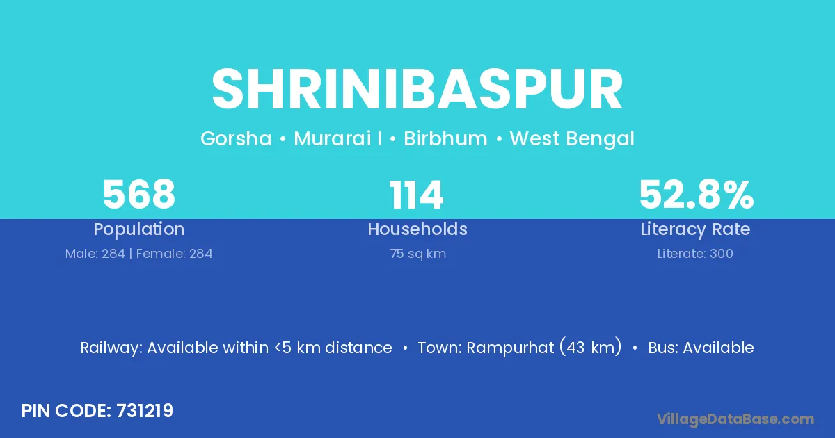 Rampurhat (43 km) is the nearest town to Shrinibaspur village for major economic activities and is located approximately 43 km away.