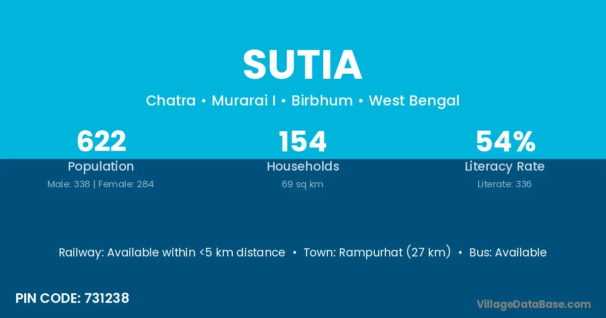 Rampurhat (27 km) is the nearest town to Sutia village for major economic activities and is located approximately 27 km away.