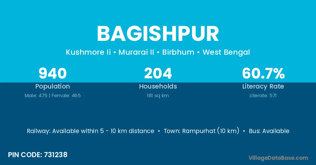 Rampurhat (10 km) is the nearest town to Bagishpur village for major economic activities and is located approximately 10 km away.