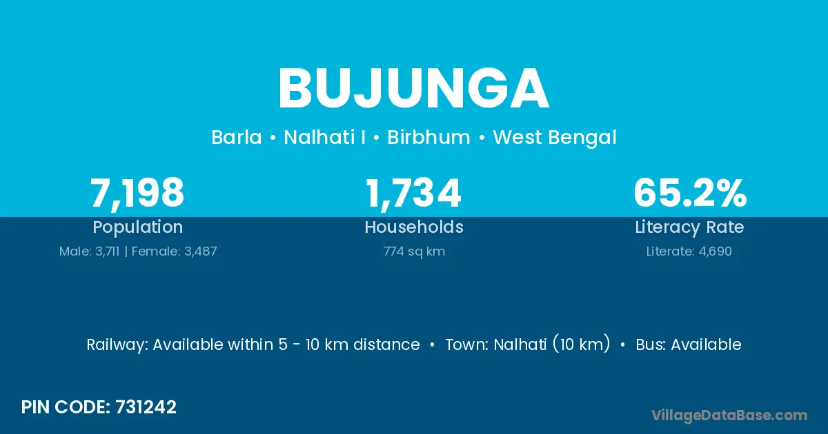 Nalhati (10 km) is the nearest town to Bujunga village for major economic activities and is located approximately 10 km away.