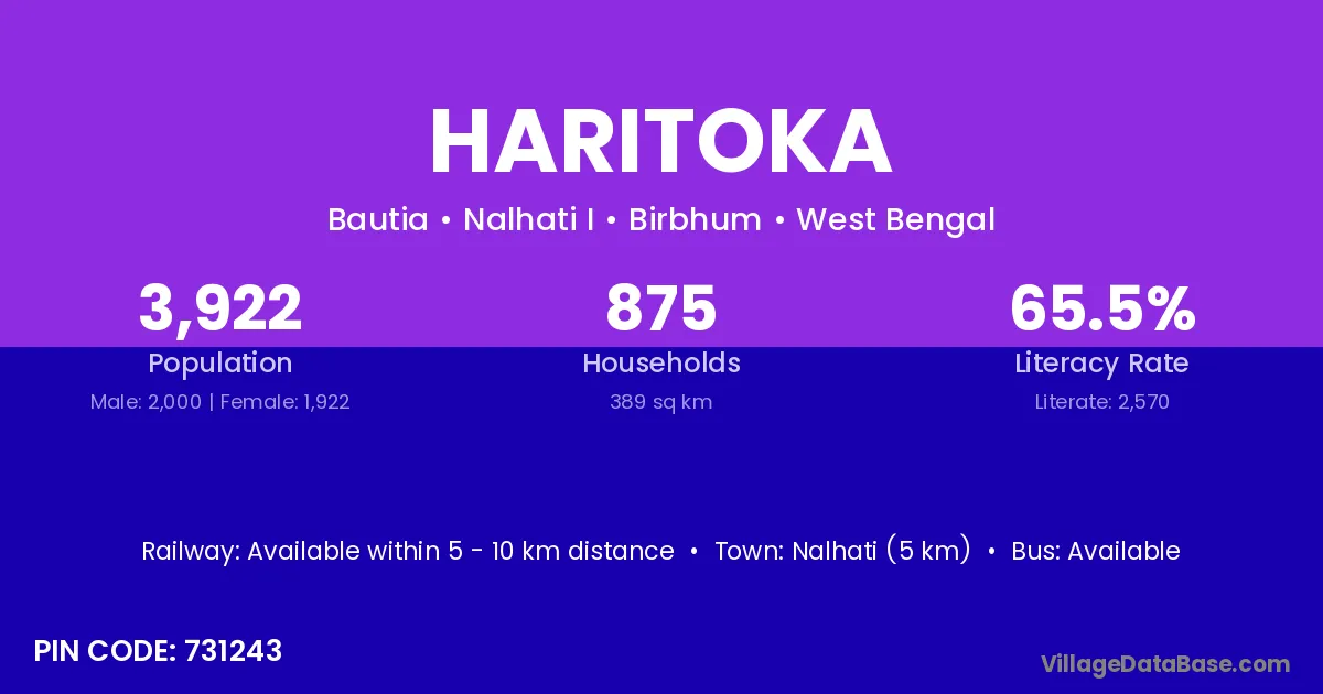 Nalhati (5 km) is the nearest town to Haritoka village for major economic activities and is located approximately 5 km away.