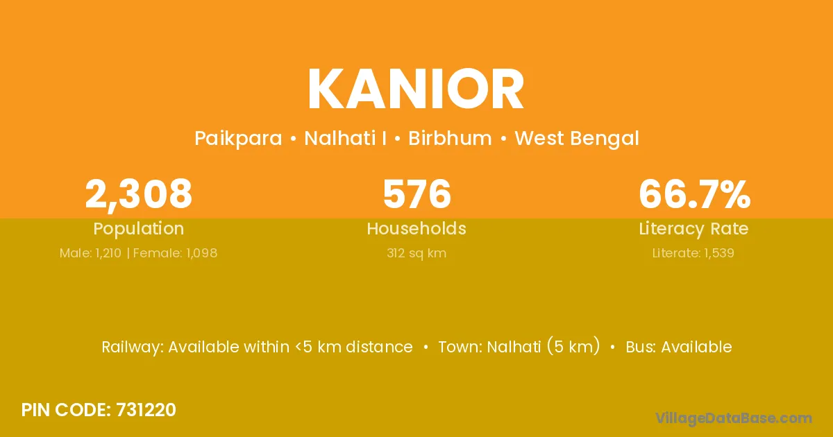 Nalhati (5 km) is the nearest town to Kanior village for major economic activities and is located approximately 5 km away.