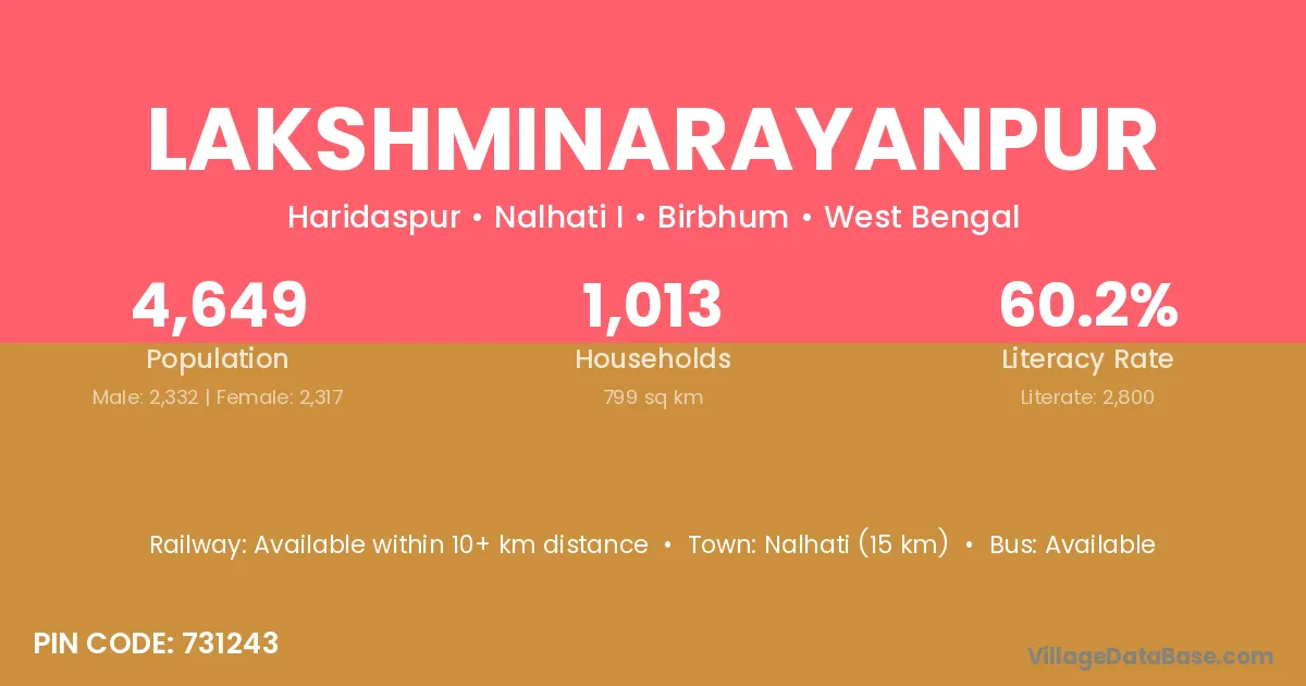 Nalhati (15 km) is the nearest town to Lakshminarayanpur village for major economic activities and is located approximately 15 km away.