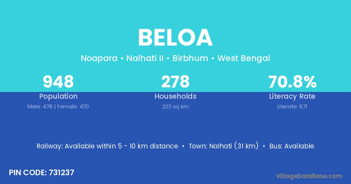 Nalhati (31 km) is the nearest town to Beloa village for major economic activities and is located approximately 31 km away.