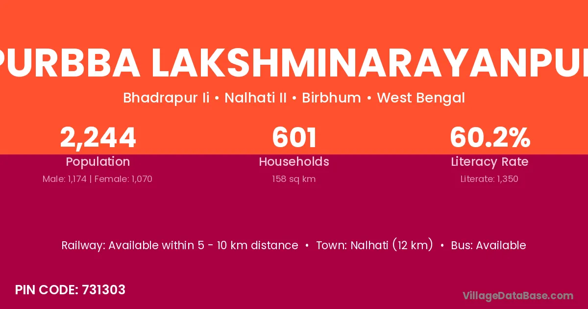 Nalhati (12 km) is the nearest town to Purbba Lakshminarayanpur village for major economic activities and is located approximately 12 km away.