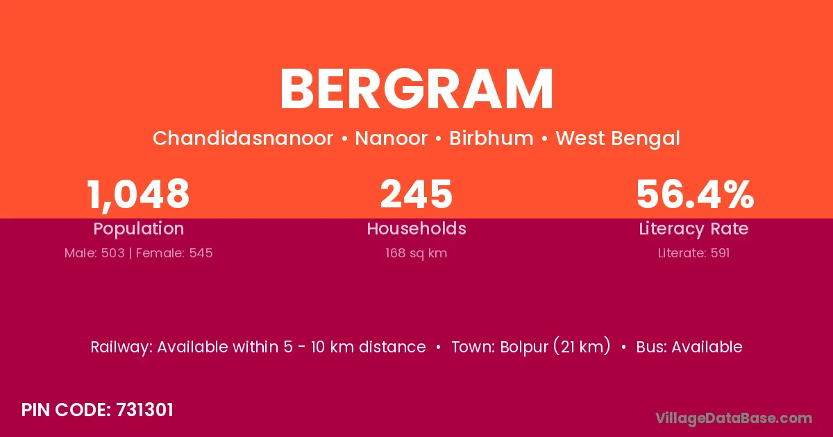Bolpur (21 km) is the nearest town to Bergram village for major economic activities and is located approximately 21 km away.