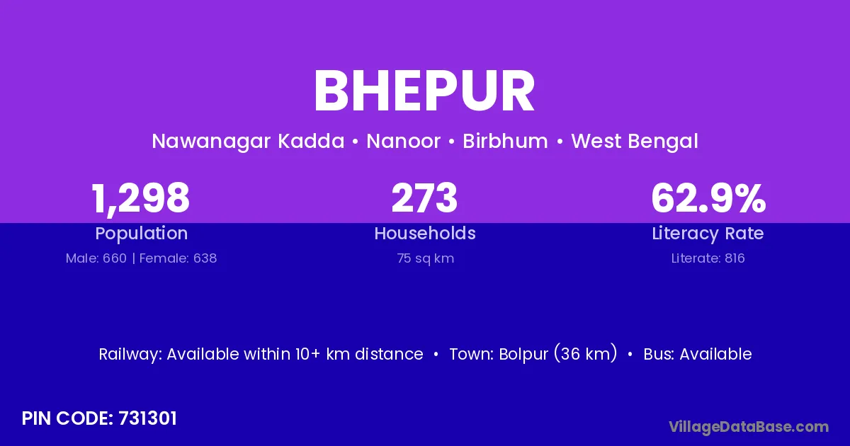 Bolpur (36 km) is the nearest town to Bhepur village for major economic activities and is located approximately 36 km away.