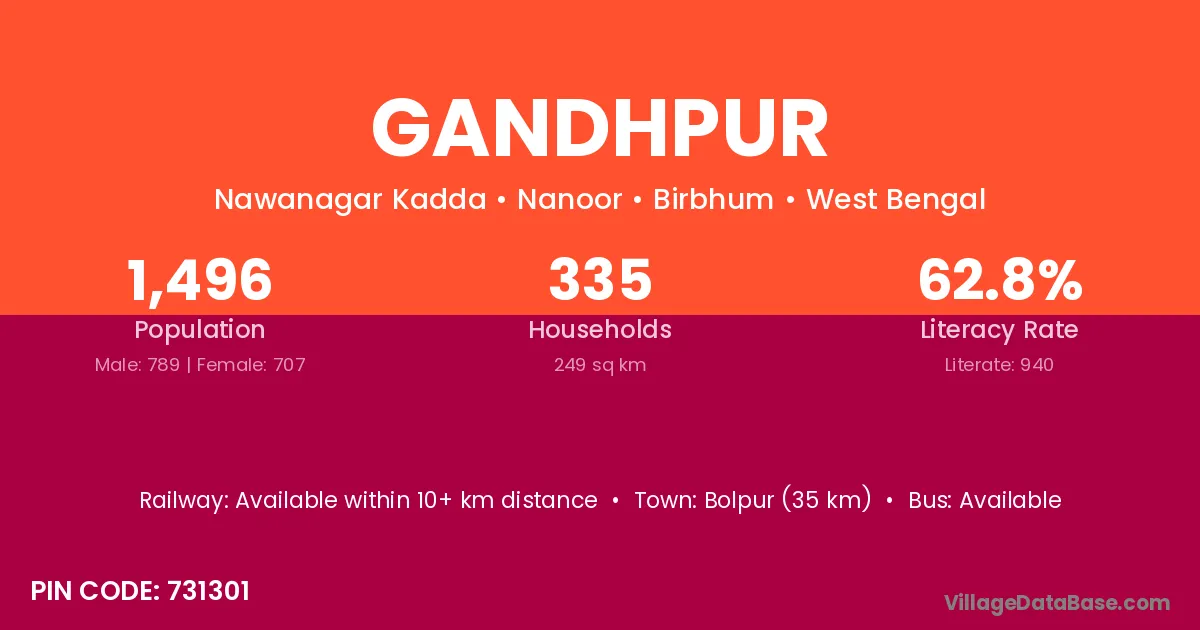 Bolpur (35 km) is the nearest town to Gandhpur village for major economic activities and is located approximately 35 km away.