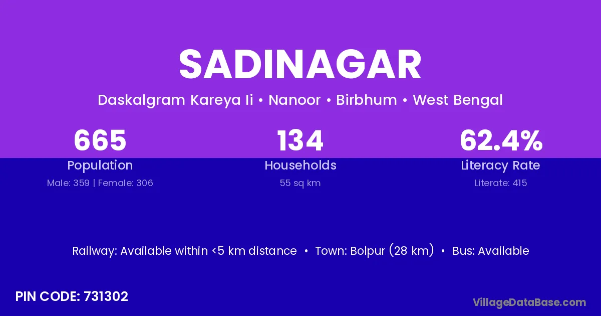 Bolpur (28 km) is the nearest town to Sadinagar village for major economic activities and is located approximately 28 km away.